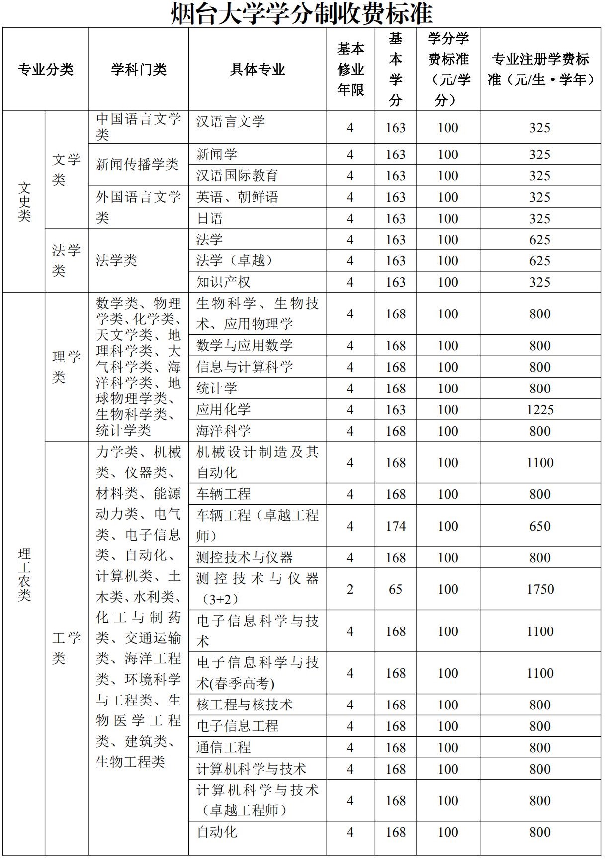 烟台大学普通本科学生实行学分制收费,按照《山东省高等学校收费管理办法》(鲁政办字【2018】98号)的有关规定执行,学费包括专业注册学费和学分学费两部分。合作办学类专业按学年制收费。