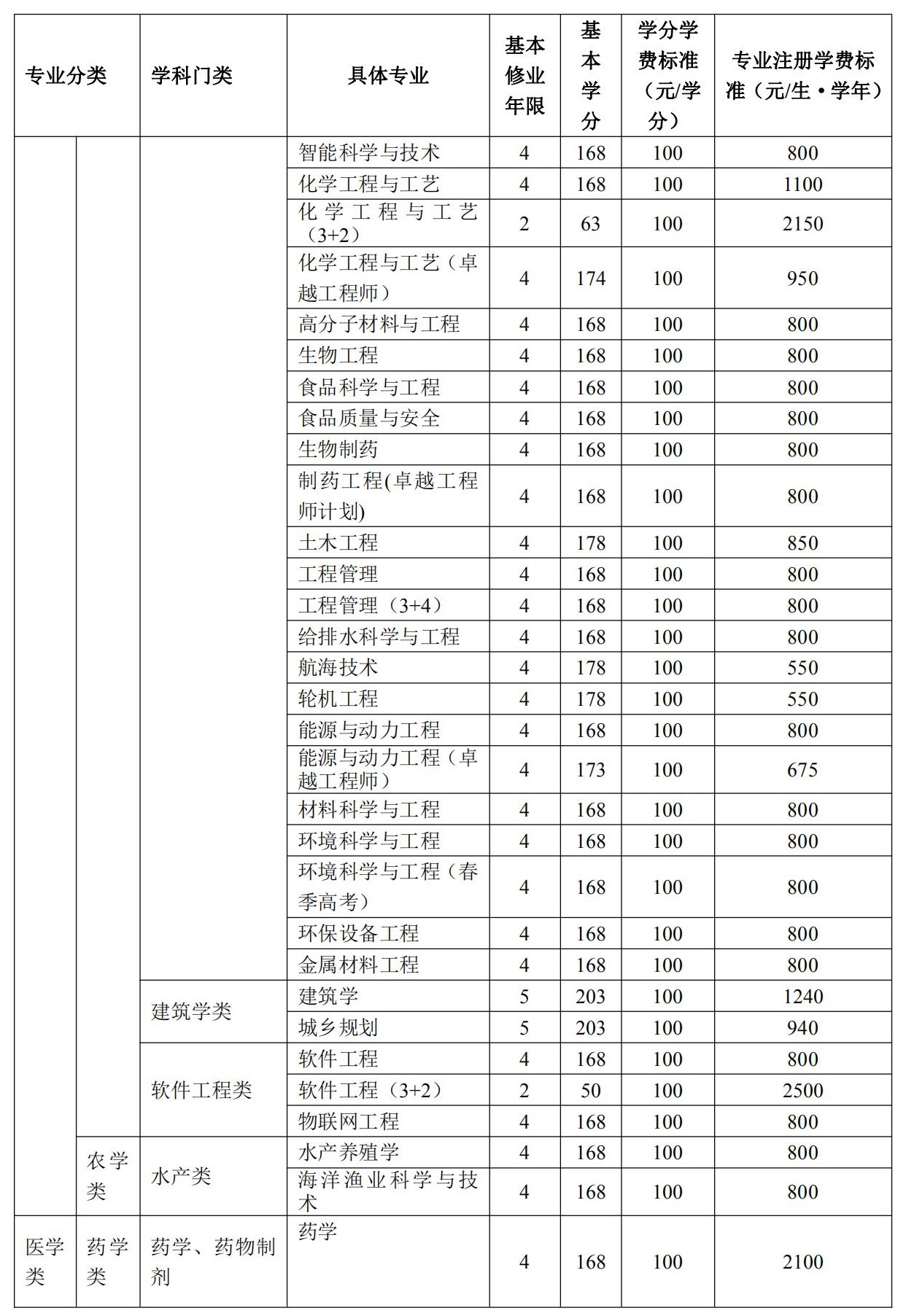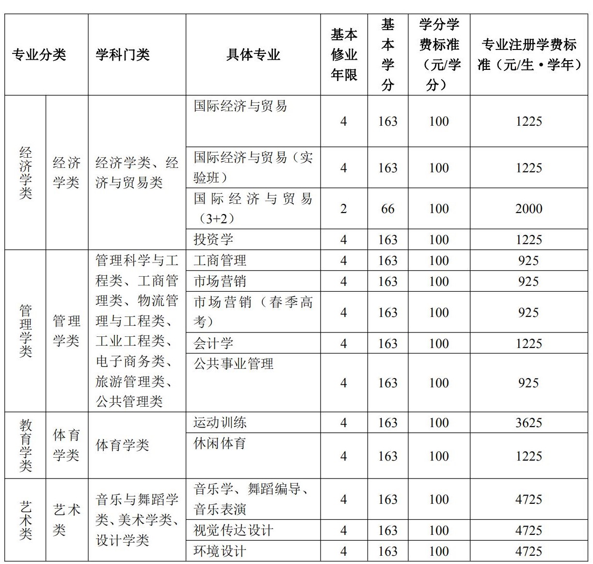学费采用学分制收费,年度学费总额=专业注册学费+学分学费,每学分100元。详见下表。此收费标准从 2019 年 9 月 1 日起执行,有效期至 2022 年 8 月 31 日。