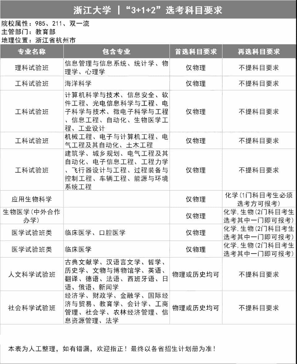 浙江大学“3+1+2”选考科目要求