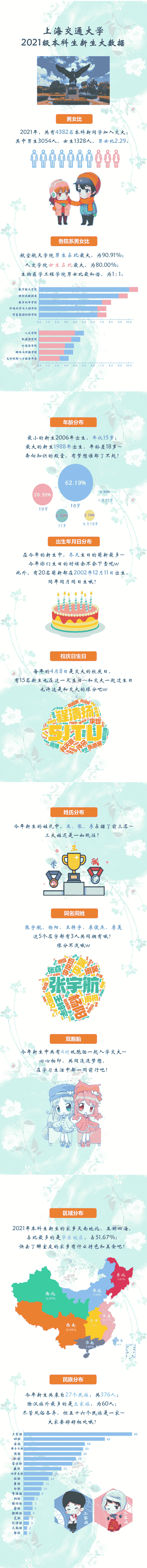 上海交通大学2021级本科生新生大数据来了,他们身上会有什么共同的特点,大家都来自哪里, 哪个学院的男女比最均衡?快来一起看看这份新鲜出炉的新生大数据吧!