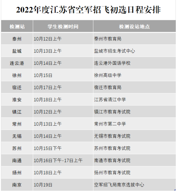 江苏2022年度空军招飞初选日程安排已经公布,根据2022年度空军招飞工作安排,10月10日—19日,空军招飞局南京选拔中心将派初选组赴各地市,对报考空军飞行学员的学生进行检测。