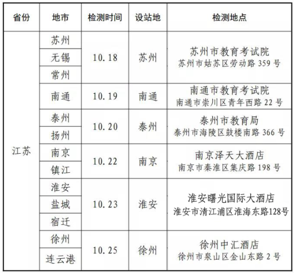 检测一般于当天上午8:00开始,需半天左右,江苏省各地市检测地点及日程安排如下:
