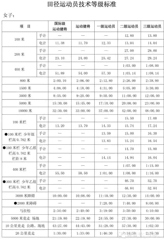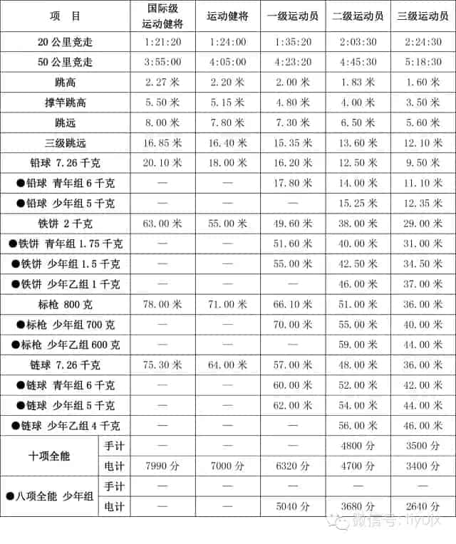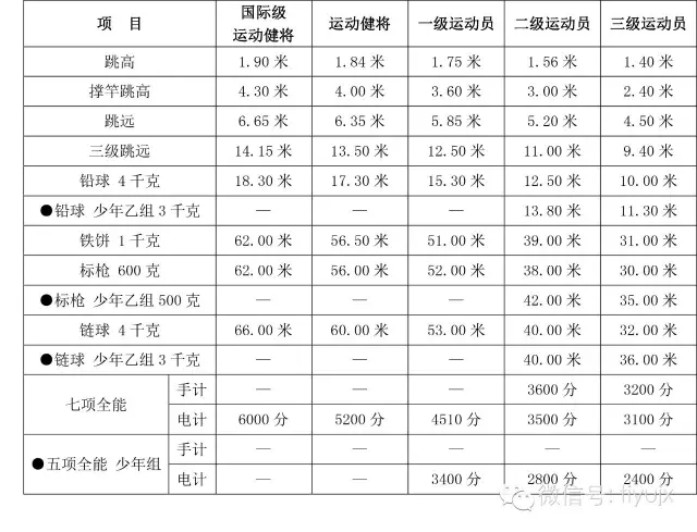 注:1. 上述国际和全国比赛各小项须至少有8人、省级和地市级比赛各小项须至少有6人上场比赛,方可授予等级称号。