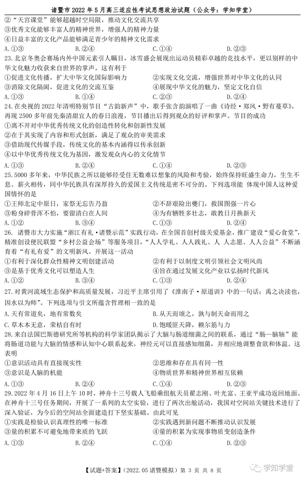 诸暨市2022年5月高三高考适应性考试思想政治试题与答案