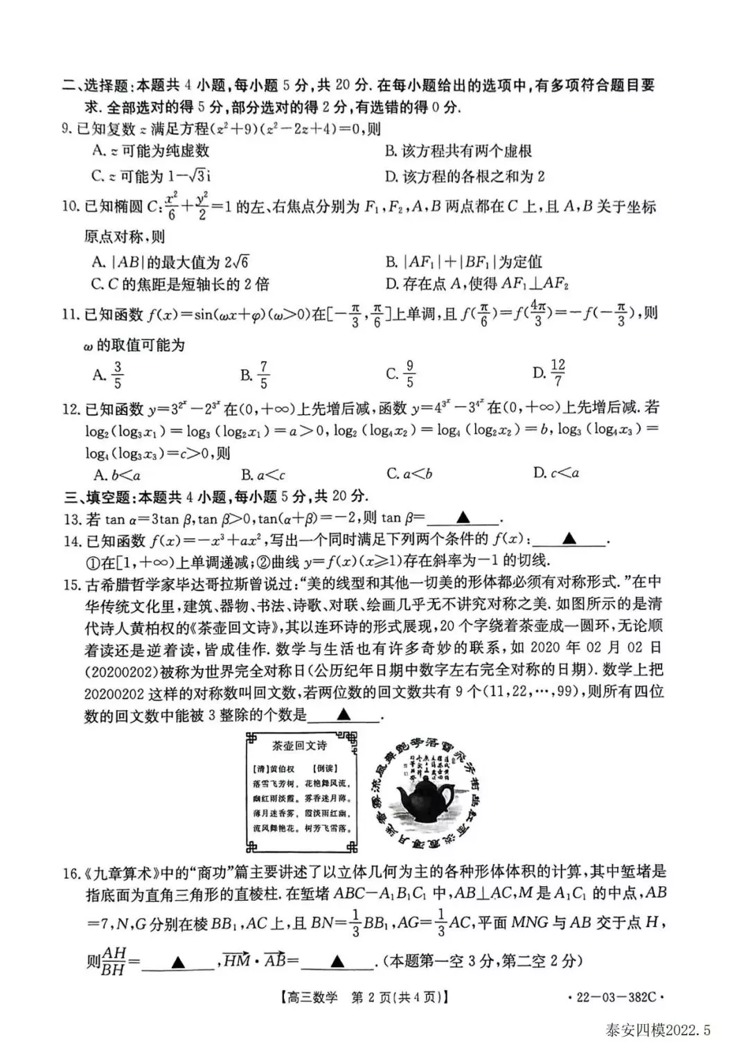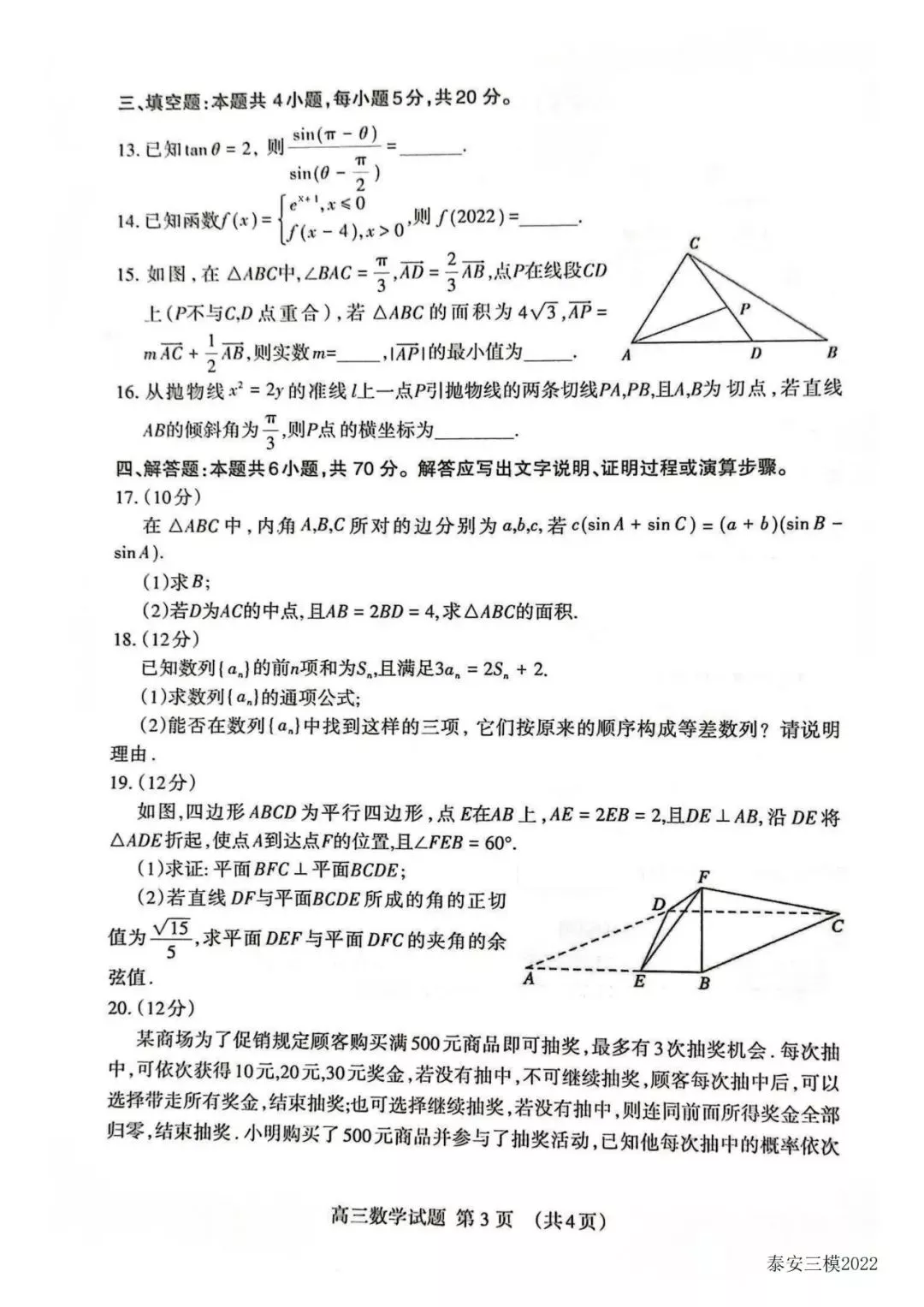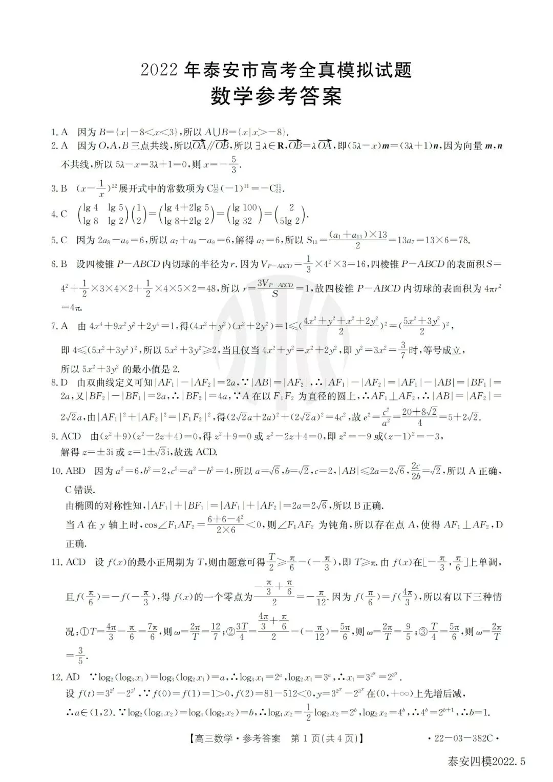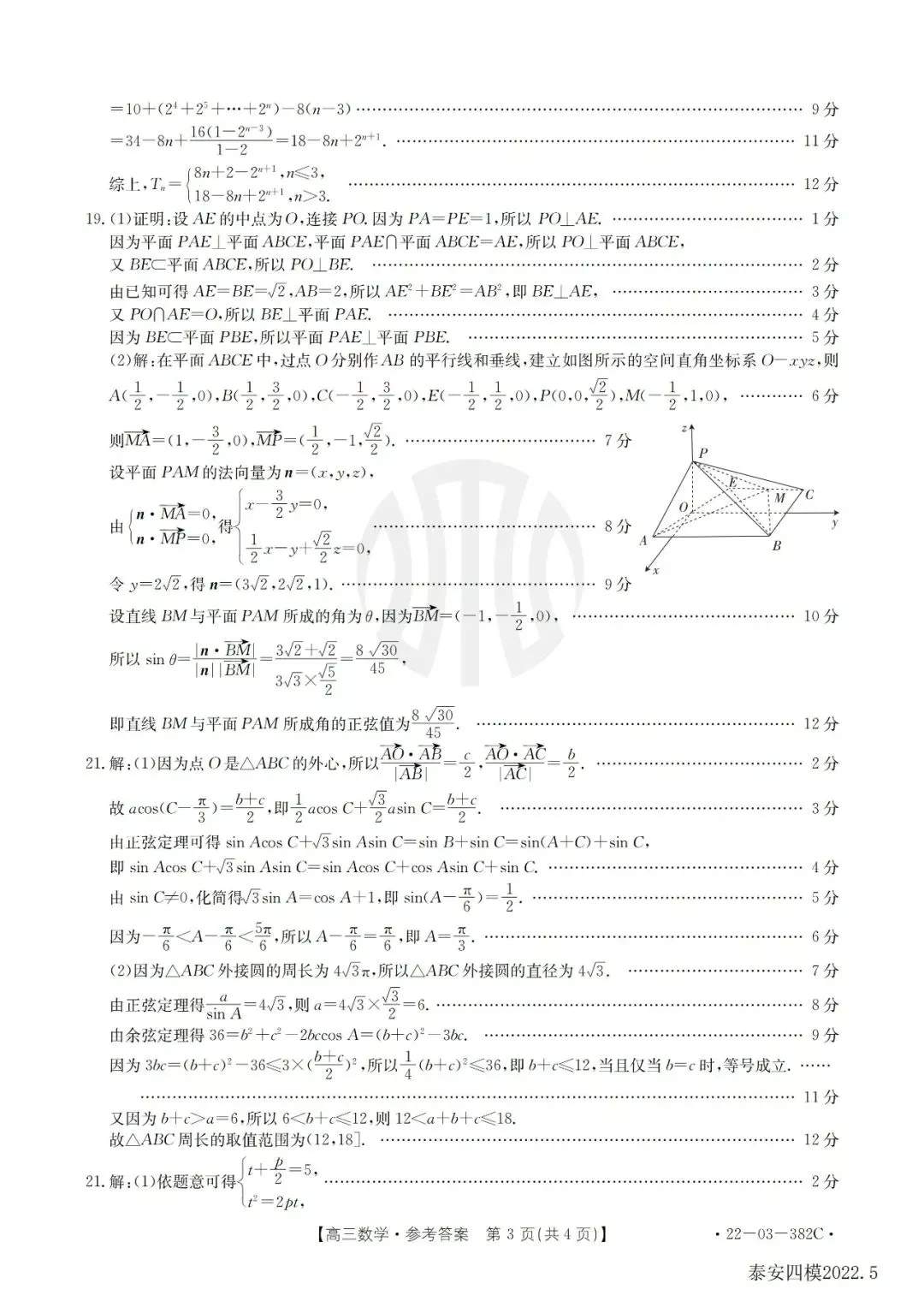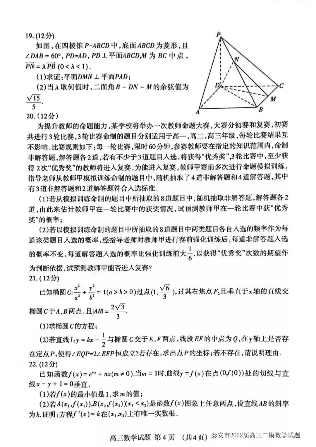 山东泰安市2022届高三二模、三模、四模数学试题及参考答案