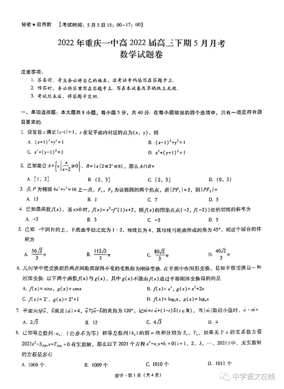 重庆一中2022届高三下学期5月考数学试题及参考答案