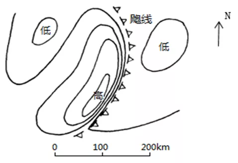 飑线是指范围小、生命史短、气压和风发生突变的狭窄强对流天气带。它来临时会出现风向突变、风力急增、气压猛升、气温骤降等强天气现象。从天气雷达图上看,飑线就像糖葫芦一样,穿起一串雷暴或积雨云。读北半球某地区等压线示意图,完成下面小题。
