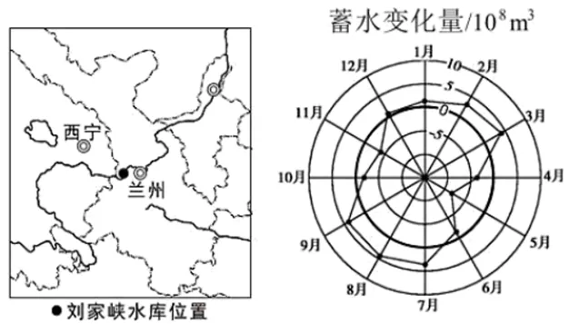 凌汛是冰凌堵塞河道,对水流产生阻力而引起江河水位明显上涨的水文现象。近年来,得益于刘家峡水库强大的调蓄能力,黄河上游宁夏段凌汛得到较大缓解,下图为“黄河上游刘家峡水库位置图及多年平均各月蓄水变化量图”,读图完成下面小题。