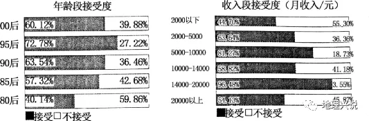 (1)以青年人群为主,95后人群接受度超七成;以收入较高人群为主,月收入14000-20000几乎全部接受。
