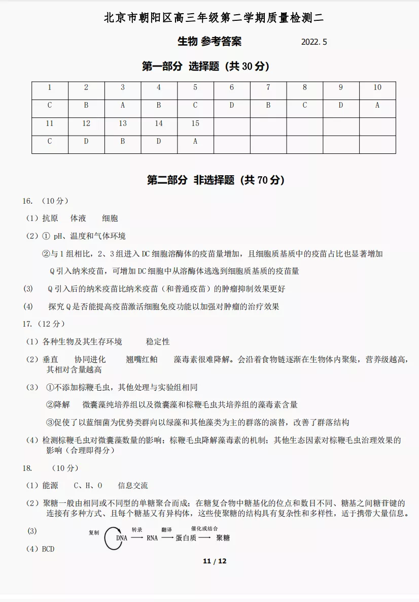 北京市朝阳区2022年高三生物二模试题和答案