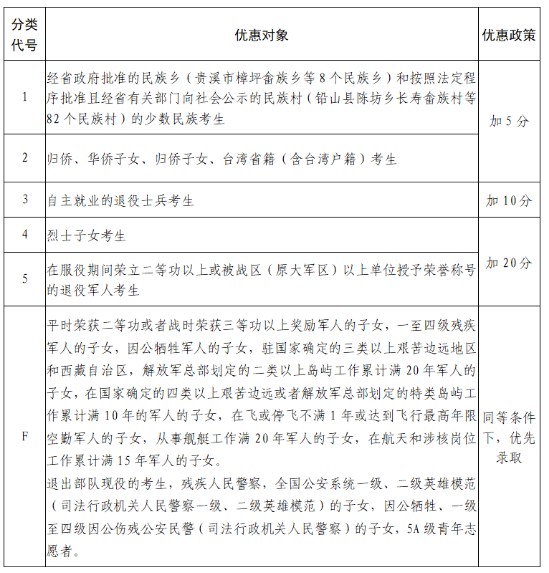 江西省2022年普通高校招生享受优惠政策考生对象共有6类。其中五类考生可以享受优惠加分,一类考生享受同等条件优先录取。具体分类情况详见《江西省2022年普通高校招生享受优惠考生分类表》(以下简称《分类表》,见下图)。根据教育部规定,所有高考加分项目及分值均不得用于高校非分省招生计划的艺术类专业、高水平艺术团、高水平运动队、高校专项计划等招生项目。