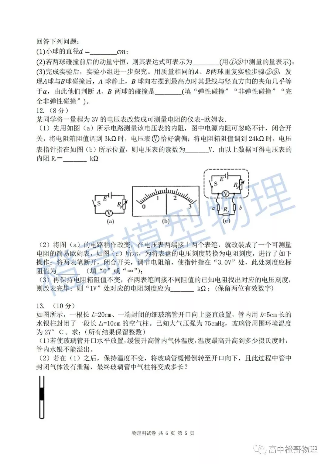 第39届全国中学生物理竞赛复赛参考答案及试题(2022年奥林匹克)