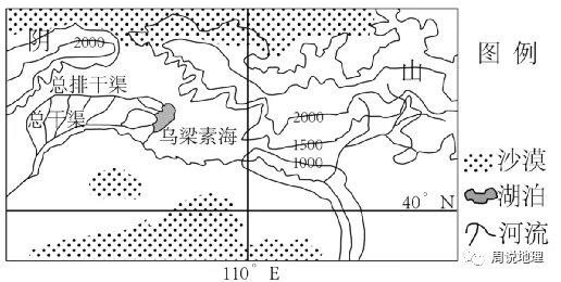 位于内蒙古自治区巴彦淖尔市境内的乌梁素海是黄河改道形成的河迹湖,中国八大淡水湖之一,素有“塞外明珠”的美誉。乌梁素海是河套灌区的重要组成部分,它接纳了河套地区90%以上的农田排水,然后经过湖泊的生物生化作用后,排入黄河,起到改善水质的作用。鉴于乌梁素海湖区补水来源不足、污染物长期积累、水体污染严重的情况,巴彦淖尔市加大了向乌梁素海生态补水力度,便水体质量得到一定程度改善。下图为鸟梁素海周边地区图,据此完成下面小题。