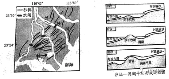 韩江为广东省潮汕平原最大河流,在其接近入海口处形成多条入海水道,在水道下游,河流和海浪共同作用下形成沙垅(下左图)。沙垅内侧形成封闭或半封闭的瀉湖(如下左图中甲湖),最终形成沙垅——潟湖平原(下右图)。当地政府为了保障韩江三角洲地区的供水安全,在韩江入海水道上建了水闸。