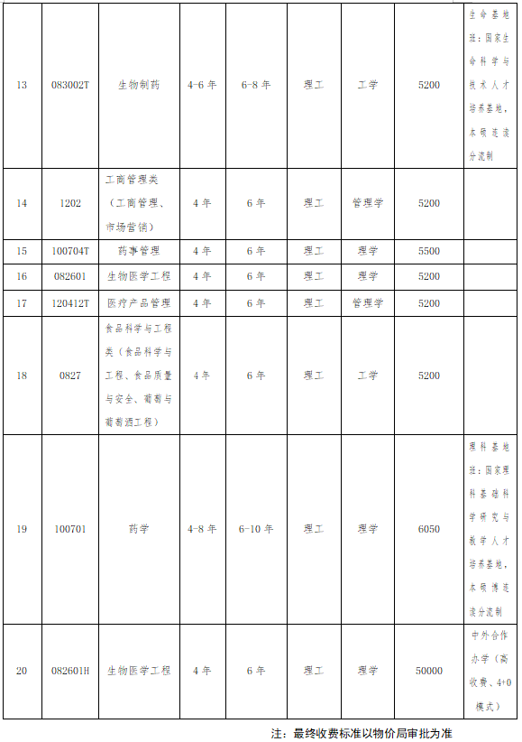 学校将按照国家要求,落实面向中西部和贫困地区的招生计划,并根据学校人才培养目标、办学条件、学生就业和各省市生源质量等实际情况确定各专业招生计划,重点培养药学领域特色学科和重点学科专业人才。学校招生计划按照省教育厅核准的分省分专业招生计划执行;高考综合改革试点省(市)设置的招生专业计划,对选考科目的要求、综合素质评价档案的使用办法,以当地教育行政部门(或招生考试部门)及高校官方网站公布为准。