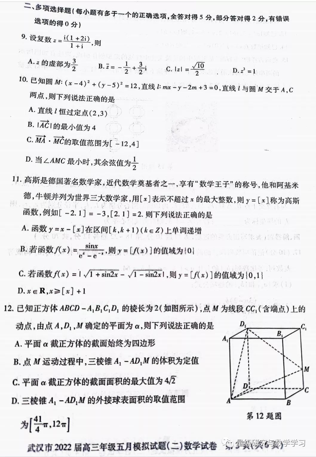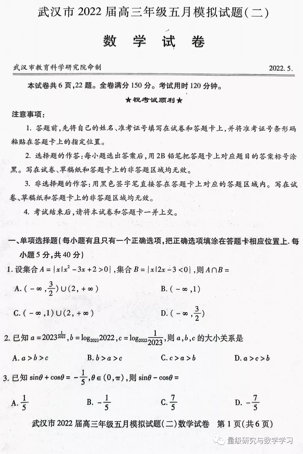 武汉市2022届高三年级五月模拟试题(二)数学试卷及参考答案