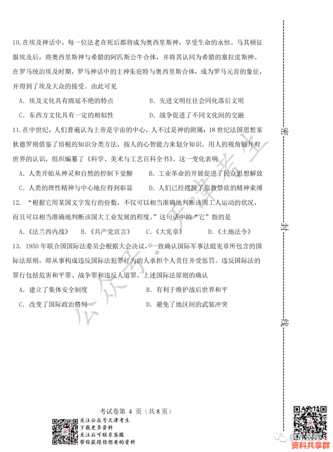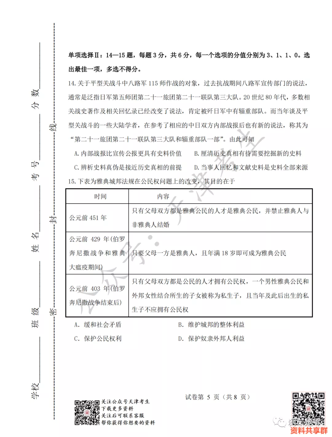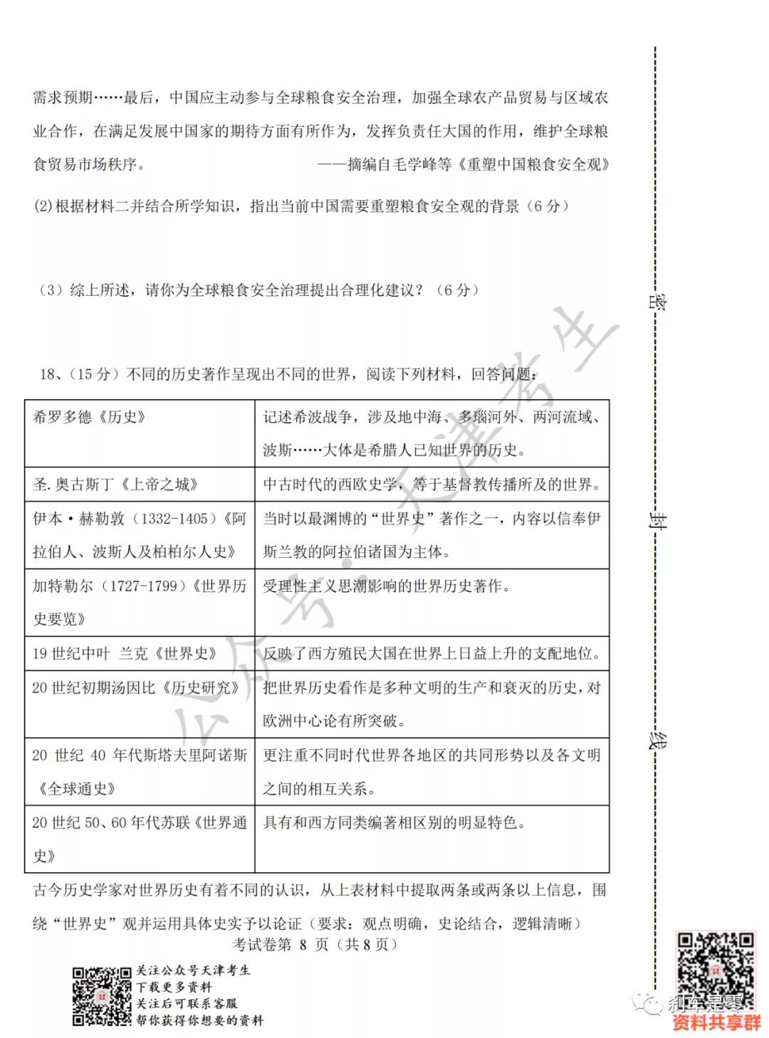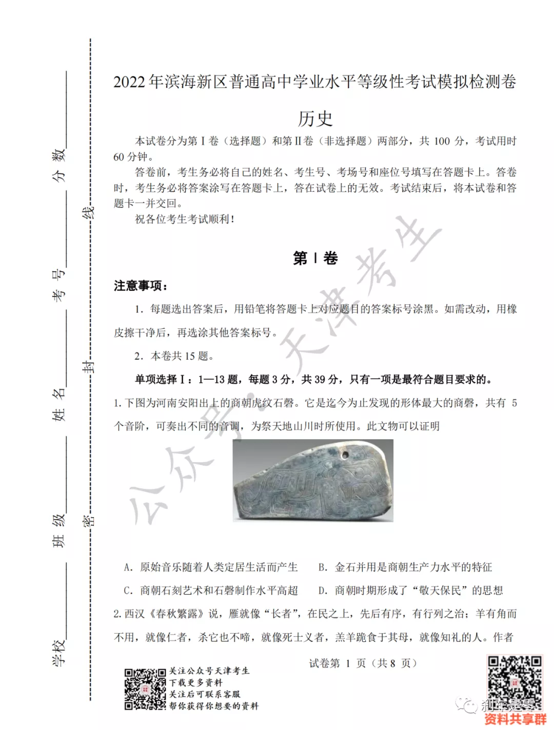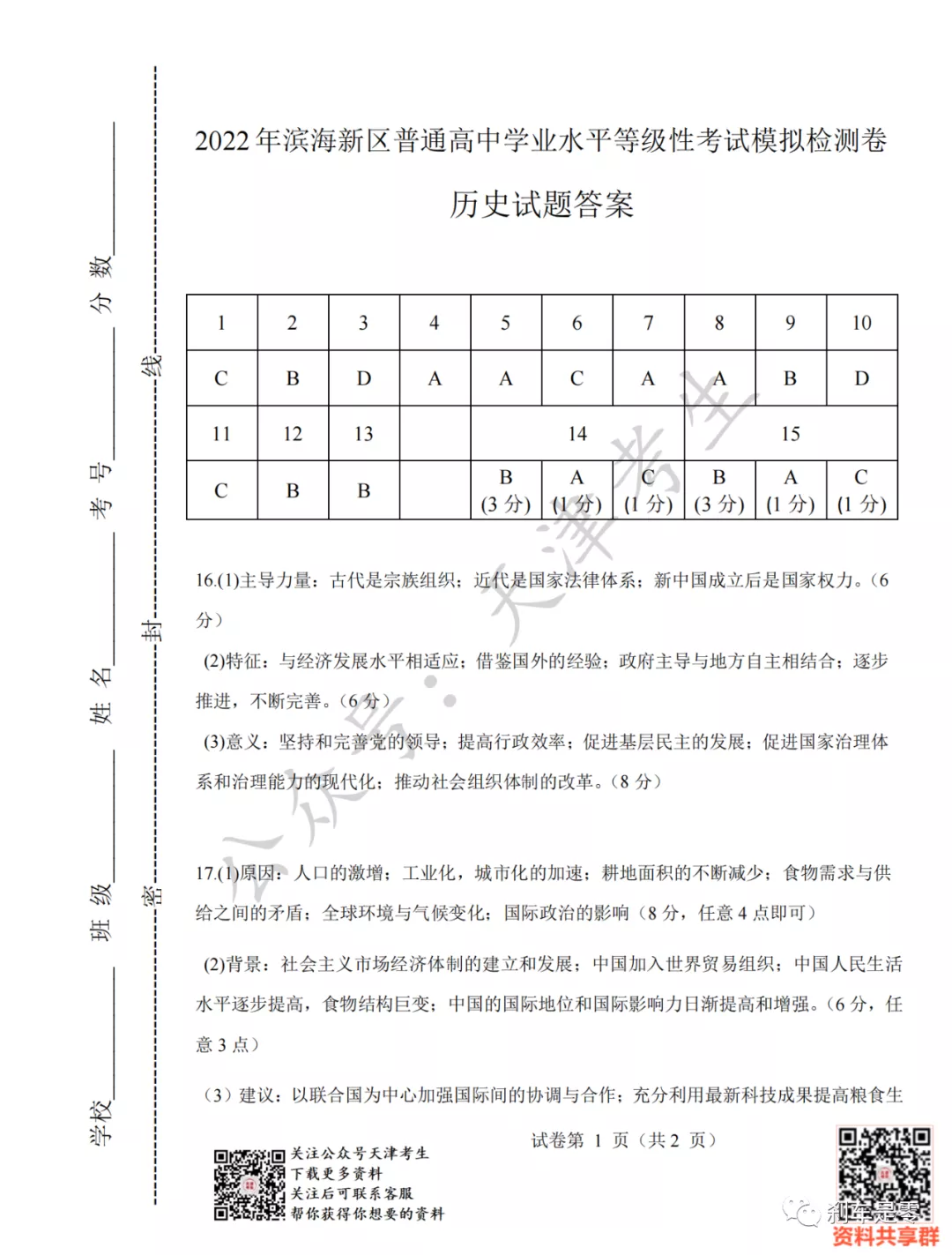 天津市滨海新区2021-2022学年度高考二模历史试卷与答案