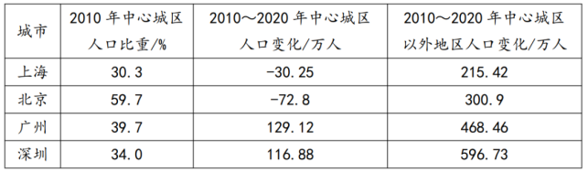 中心城区通常为城市中人口最密集的区域。表1数据显示上海、北京、广州、深圳四城市2010年中心城区人口比重及2010~2020年中心城区和中心城区以外地区人口数量的变化。据此完成1~3题。