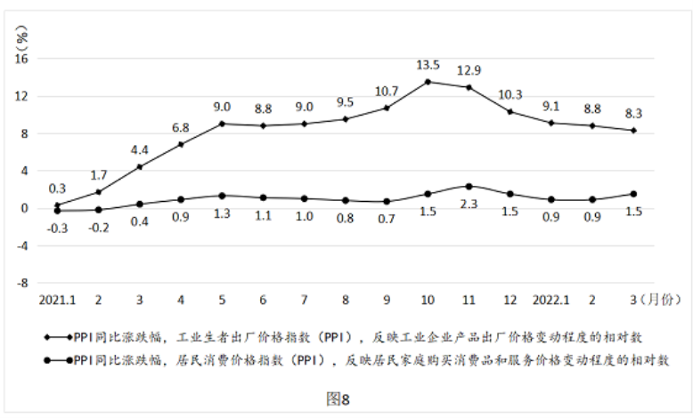 2021 年以来,以原油、铁矿石、有色金属等工业基础原材料为代表的国际大宗商品价格持续上涨,直接推高我国工业生产者出厂价格指数(PPI)但PPI上行并未驱动居民消费价格指数(CPI)同步上行,PPI与CPI总体呈“剪刀差”变化(见图8)。这一状况对我国产业链上游部分企业有好处,对大量处于产业链中下游的中小企业,如以钢板、铜材、橡胶、ABS塑料为主要原材料的小家电生产企业,却带来了很大的生产经营压力。