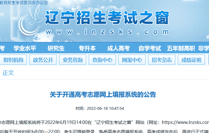 2022年辽宁省高考志愿网上填报系统将于2022年6月19日14:00在“辽宁招生考试之窗”网站(网址:https://www.lnzsks.com/)开通。“辽宁招生考试之窗”为志愿填报的唯一网站。考生可在规定时间内,使用高考报名时的账号和密码通过“辽宁招生考试之窗网站”(https://www.lnzsks.com/)进入“网报中心”,也可直接输入网址:https://gkzy.lnzsks.com,登录志愿填报系统。除正式志愿填报截止日外,开通后每天开放时间为8:00—22:00。考生可提前登录、熟悉高考志愿填报系统,高考成绩发布后,再进行正式填报、调整和确认,正式志愿填报截止时间为2022年6月30日16:00。高考志愿网上填报系统开放期间,考生在我省高考志愿网上填报系统中填报的志愿均有效。