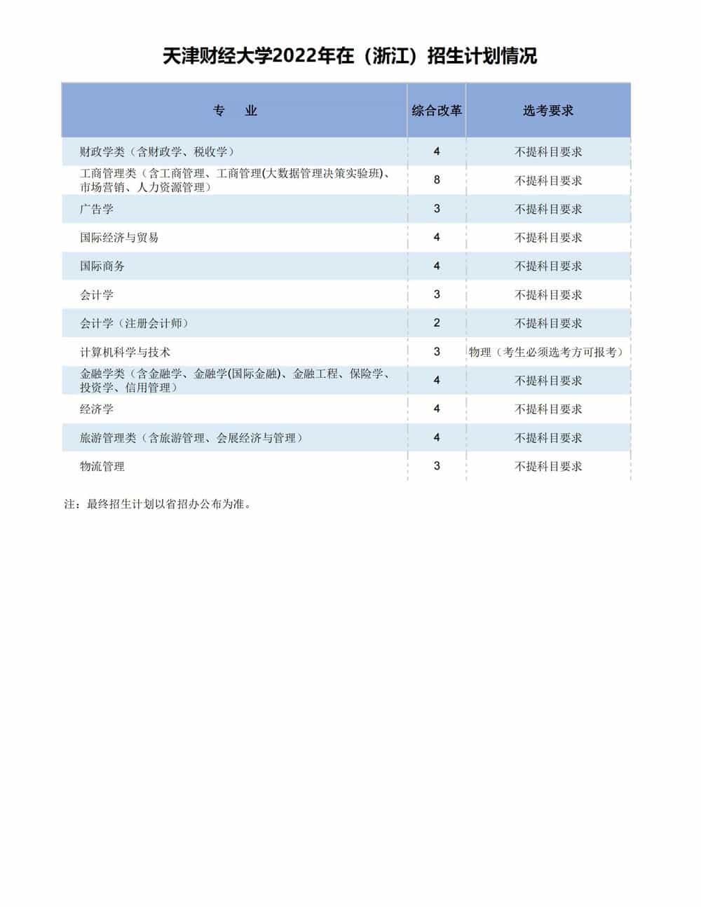 2022年天津财经大学在天津招生计划中法学专业招生50人、财务管理专业招生33人,在浙江招生计划中广告学专业招生3人、国际商务专业招生4人,在四川招生计划中法学专业招生2人、财务管理专业招生3人。