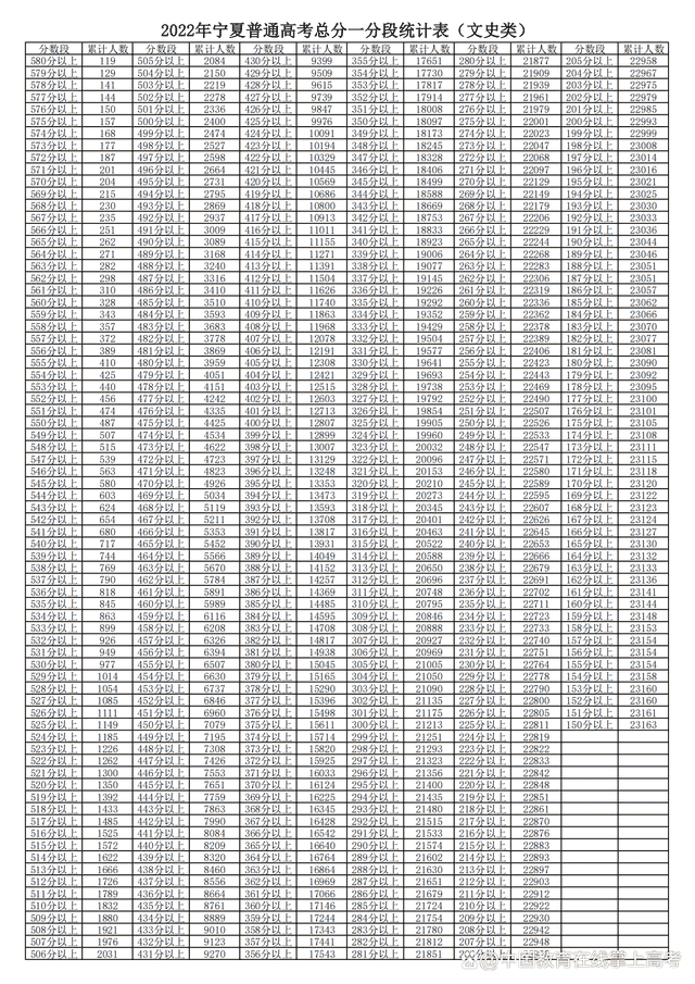 2022宁夏高考文理科一分一段统计及位次排名查询表汇总 时间:2022-06-23 15:56 分数线 目前宁夏高考分数线已公布,同学们及家长们肯定关心2022宁夏省高考文科和理科一分一段表及成绩位次排名情况,本文将大家详细介绍一下,供大家参考。 2022宁夏高考一分一段统计表