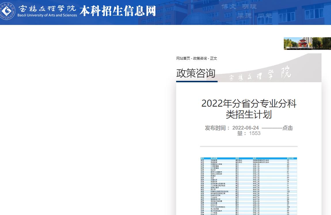 宝鸡文理学院2022年分省分专业分科类招生计划 时间:2022-06-26 10:59 招生计划 文章来源(官网发布地址):http://ein.bjwlxy.cn/info/1004/1070.htm官网发布缓存图(部分):