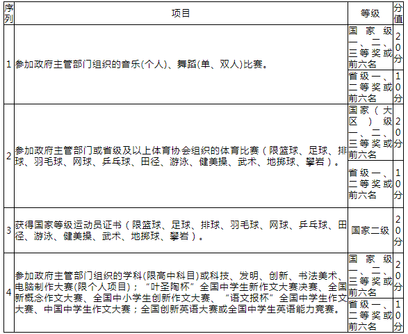 我校鼓励具有特长并在各类比赛中表现突出的考生报考我校。在高中阶段,凡符合下列条件之一,可申报素质特长赋分。学校将根据考生递交佐证材料的性质,由校提前招生领导小组集体审定,实行“列举对号”计分;同一素质特长取最高项,不同素质特长可累计,但最高得分不超过20分。具体项目、等级和分值如下: