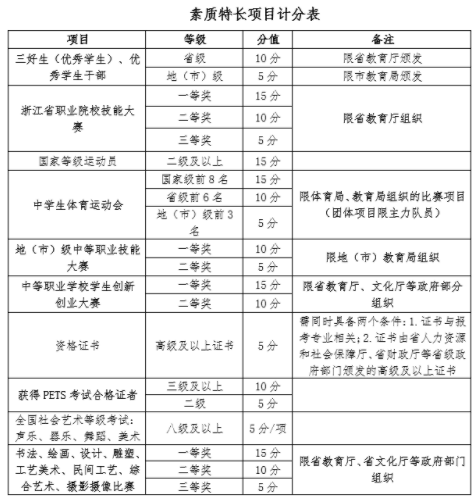 考生凡在高中阶段符合素质特长计分办法所列条件的,若符合多项计分条件的,同类项计分只取高分项;不同类项可累计计分,但累计分值最高不超过20分。凡是符合素质特长加分条件的考生,现场确认时必须提交计分证明资料。具体计分方法见下表。