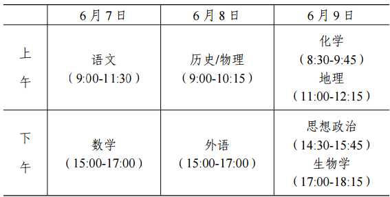 考试时间为6月7日-6月9日。7号考语文(9:00-11:30)、数学(15:00-17:00);8号考历史/物理(9:00-10:15)、外语(15:00-17:00);9号考化学(8:30-9:45)、地理(11:00-12:15)、思想政治(14:30-15:45)、生物学(17:00-18:15)。