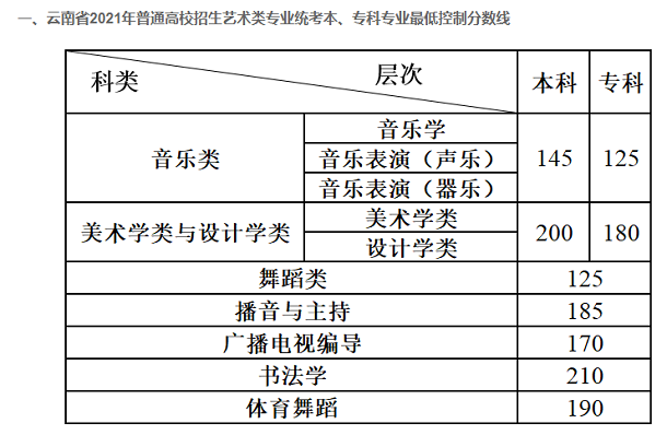 2021云南省艺术类专业最低控制分数线
