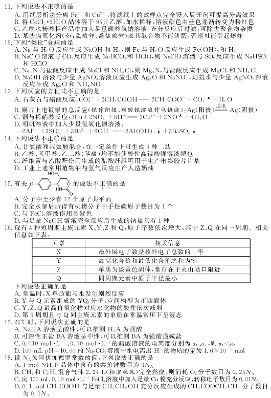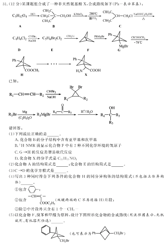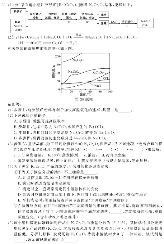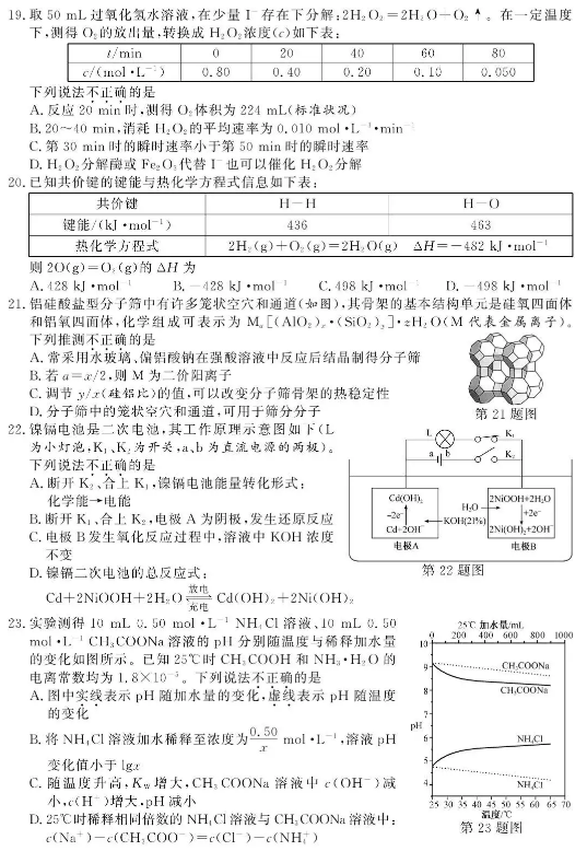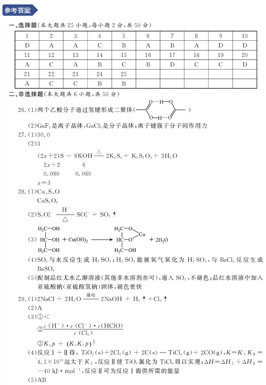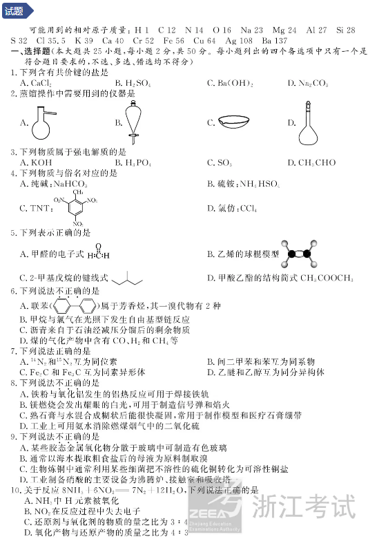 浙江2021年1月化学选考试题及答案