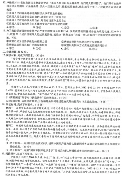 2021福建八省联考政治试题及答案 时间:2021-02-02 10:37 文综试题 八省联考语文、数学、外语,3门全国统考科目由教育部考试中心命题,所以语数外3门科目8省采用一张试卷。物理、历史、化学、地理、政治、生物,为选考科目,由各省市自行命题,所以使用自己的地方卷,而不是统一的全国卷。福建八省联考政治试题