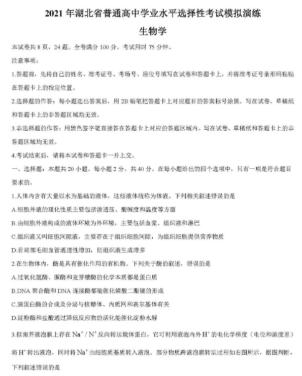 2021年湖北省八省联考生物试题及答案