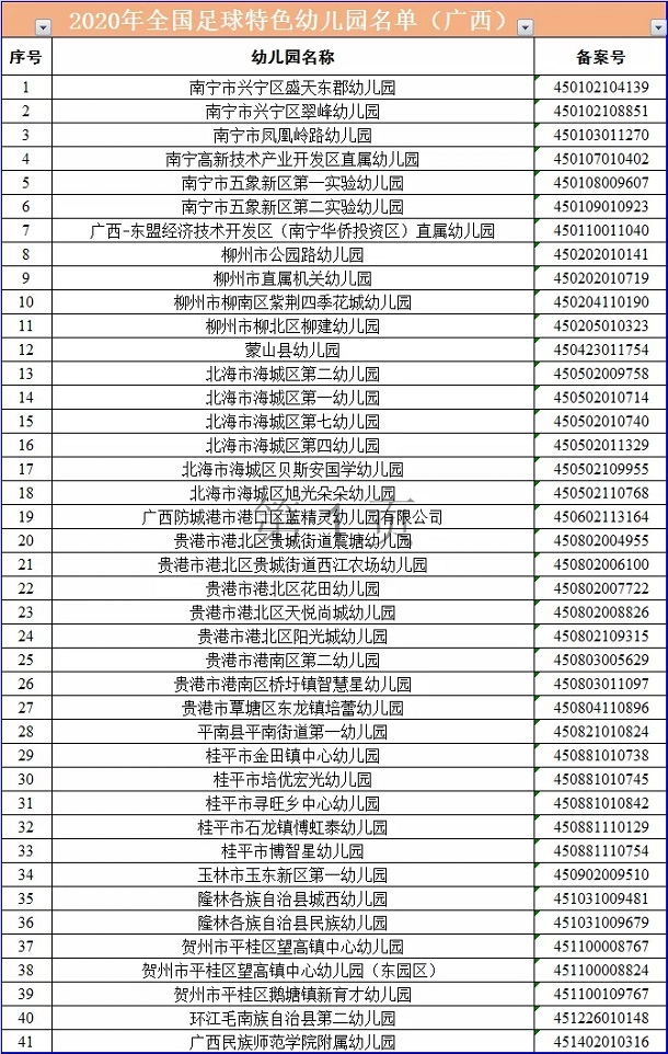 近日,教育部公布了2020年全国青少年校园足球特色学校、试点县(区)、“满天星”训练营和足球特色幼儿园名单,其中广西共95所中小学校入选“全国青少年校园足球特色学校”,41所幼儿园入选“全国足球特色幼儿园”。