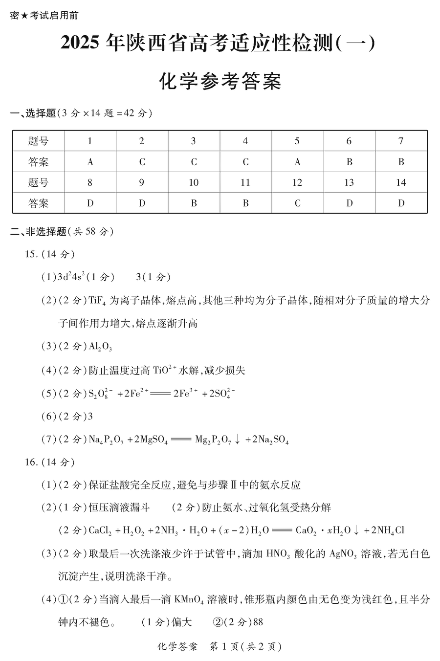 陕西省2025届高考适应性检测一化学试题及答案 时间:2024-11-13 14:59 陕西 理综试题 陕西省2025届高考适应性检测一化学考试已于近日开考,为方便考生考后及时查看考试情况,查漏补缺、弥补不足,本文整理了试题答案解析相关信息! 汇总:陕西省2025届高考适应性检测一试题及答案汇总 化学试题及答案解析