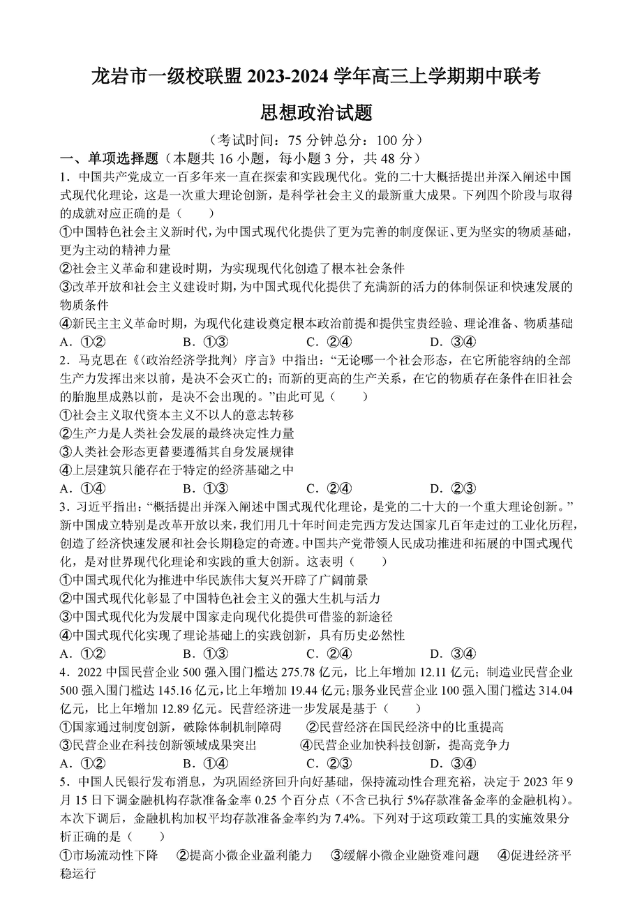 福建龙岩一级校联2025届高三上11月期中政治试题及答案