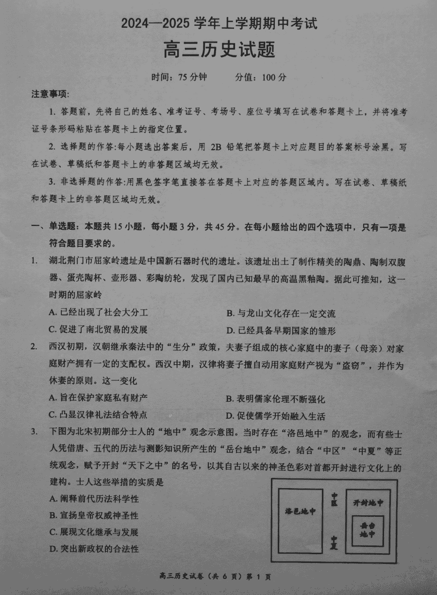 湖北省新高考协作体2025届高三期中历史试题及答案