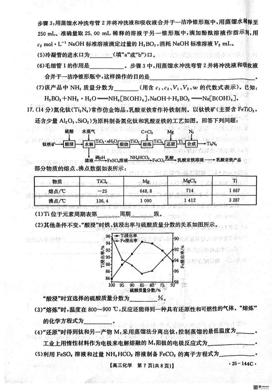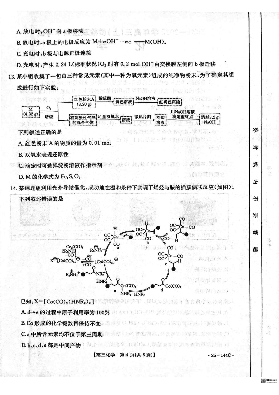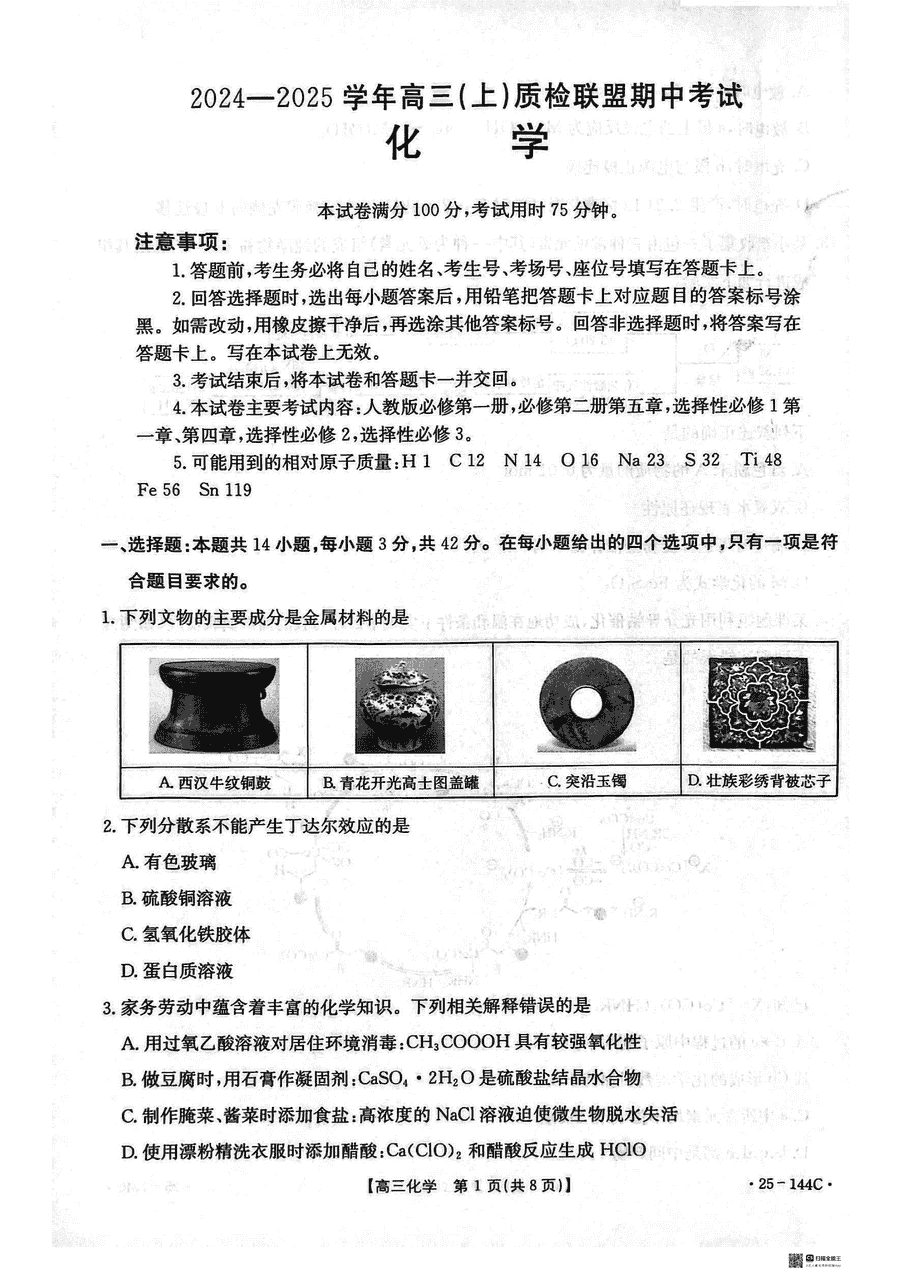 邢台市质检联盟2025届高三上11月期中化学试题及答案