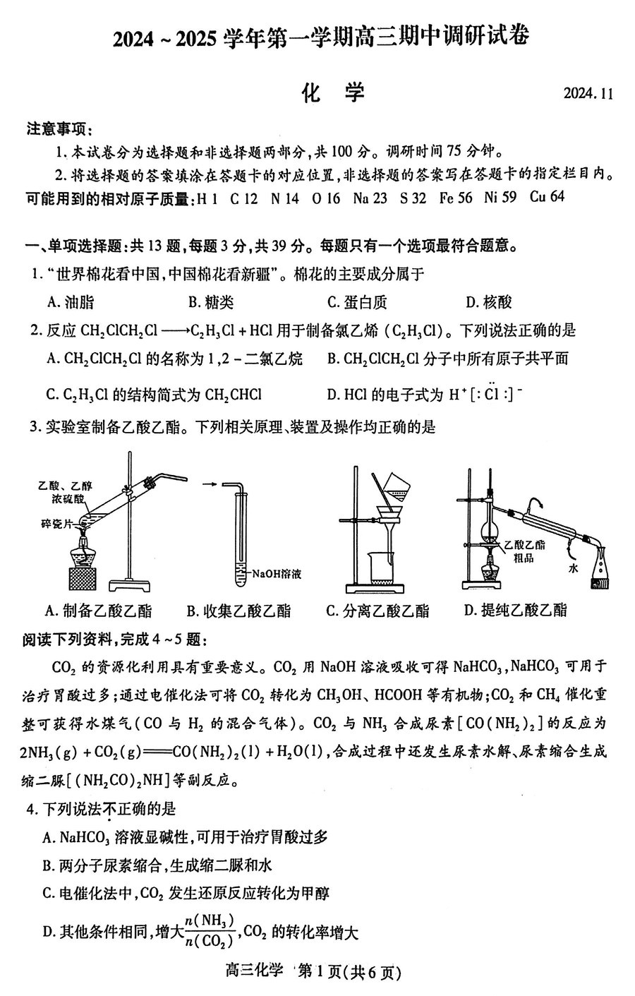 苏州2024-2025学年高三上学期11月期中化学试题及答案