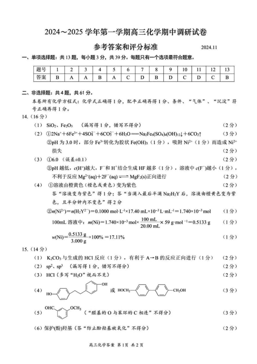 苏州市2024-2025学年高三上学期11月期中调研化学考试已于近日开考,为方便考生考后及时查看考试情况,查漏补缺、弥补不足,本文整理了试题答案解析相关信息!