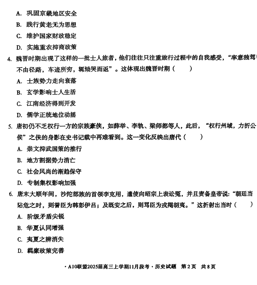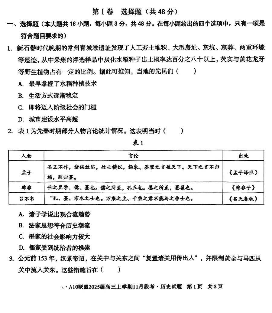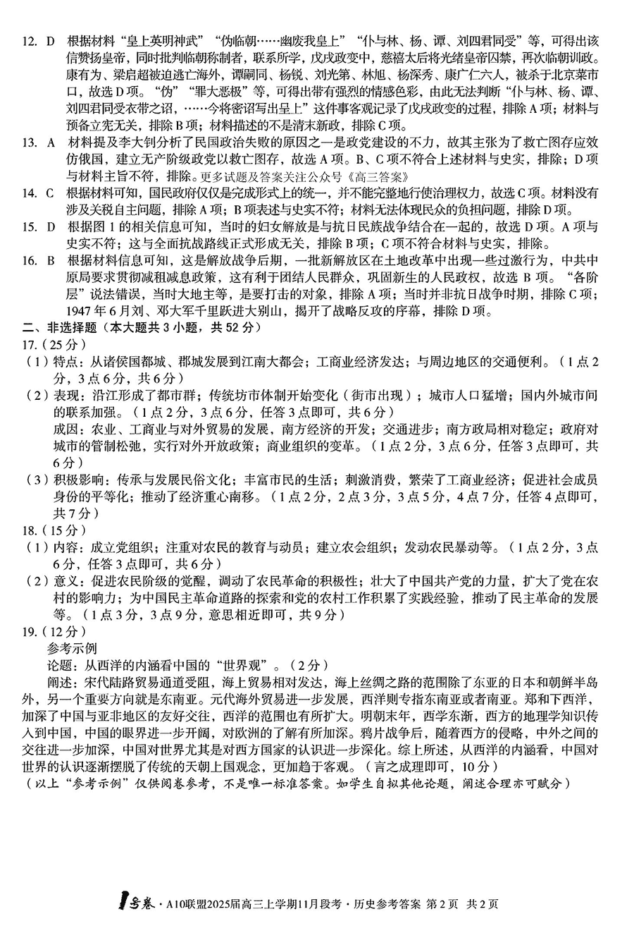 安徽A10联盟2025届高三11月段考历史试题及答案