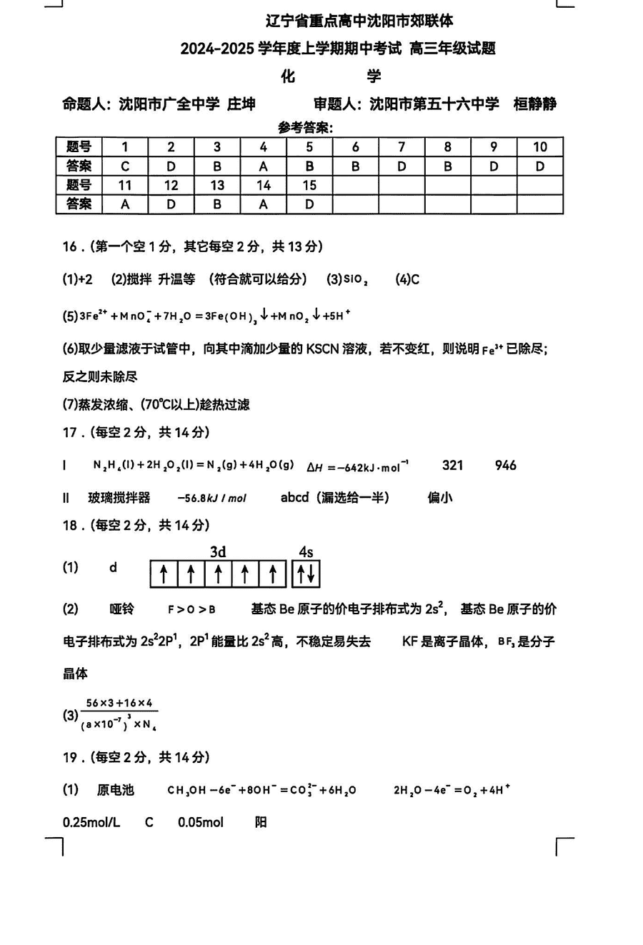 沈阳市郊联体2024-2025学年高三上学期11月期中化学考试已于近日开考,为方便考生考后及时查看考试情况,查漏补缺、弥补不足,本文整理了试题答案解析相关信息!