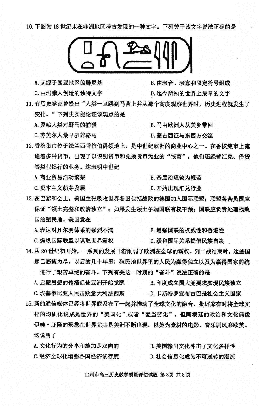 台州市2025届高三第一次教学质量评估历史试题及答案