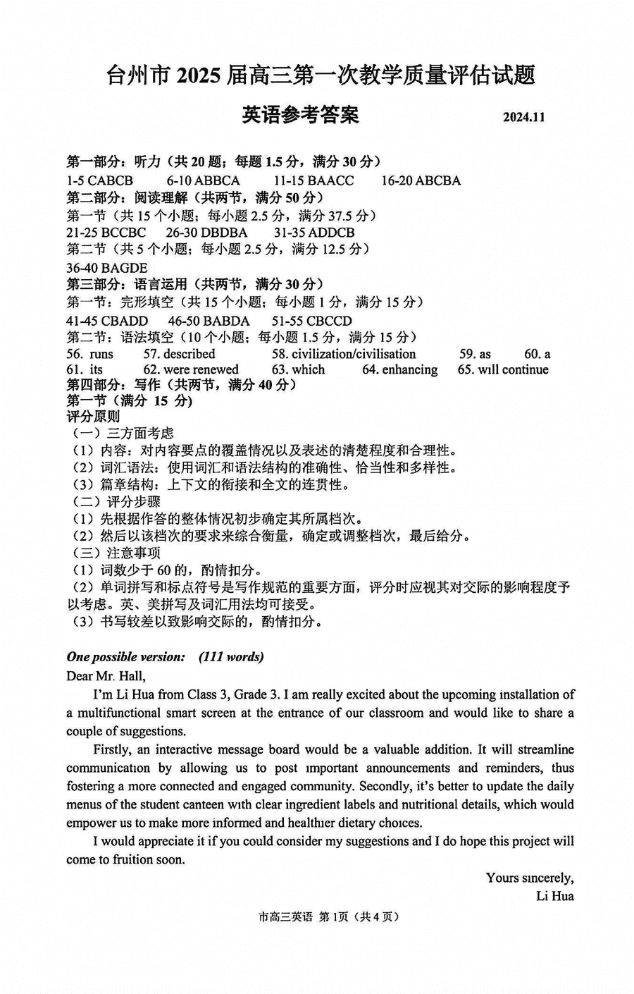 台州市2025届高三第一次教学质量评估英语试题及答案 时间:2024-11-17 01:58 浙江 英语试题 2025届江西省九校联考高三上学期11月期中英语考试已于近日开考,为方便考生考后及时查看考试情况,查漏补缺、弥补不足,本文整理了试题答案解析相关信息! 汇总:台州市2025届高三第一次教学质量评估试题及答案汇总 英语试题及答案解析