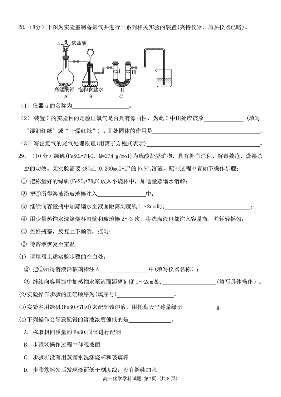 嘉兴八校2024-2025学年高一期中化学试题及答案