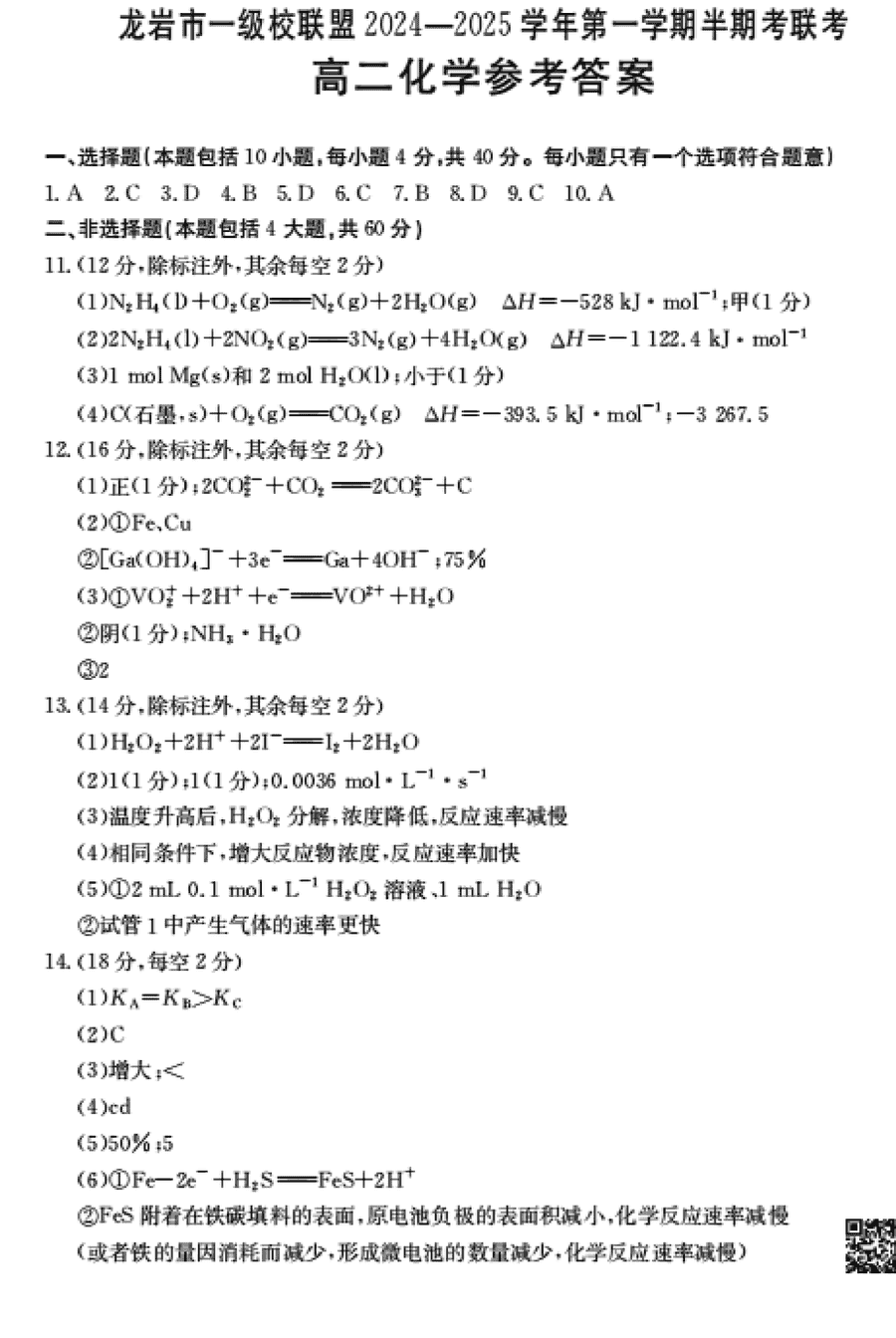 龙岩市一级校联盟2024-2025学年高二上11月期中化学试题及答案