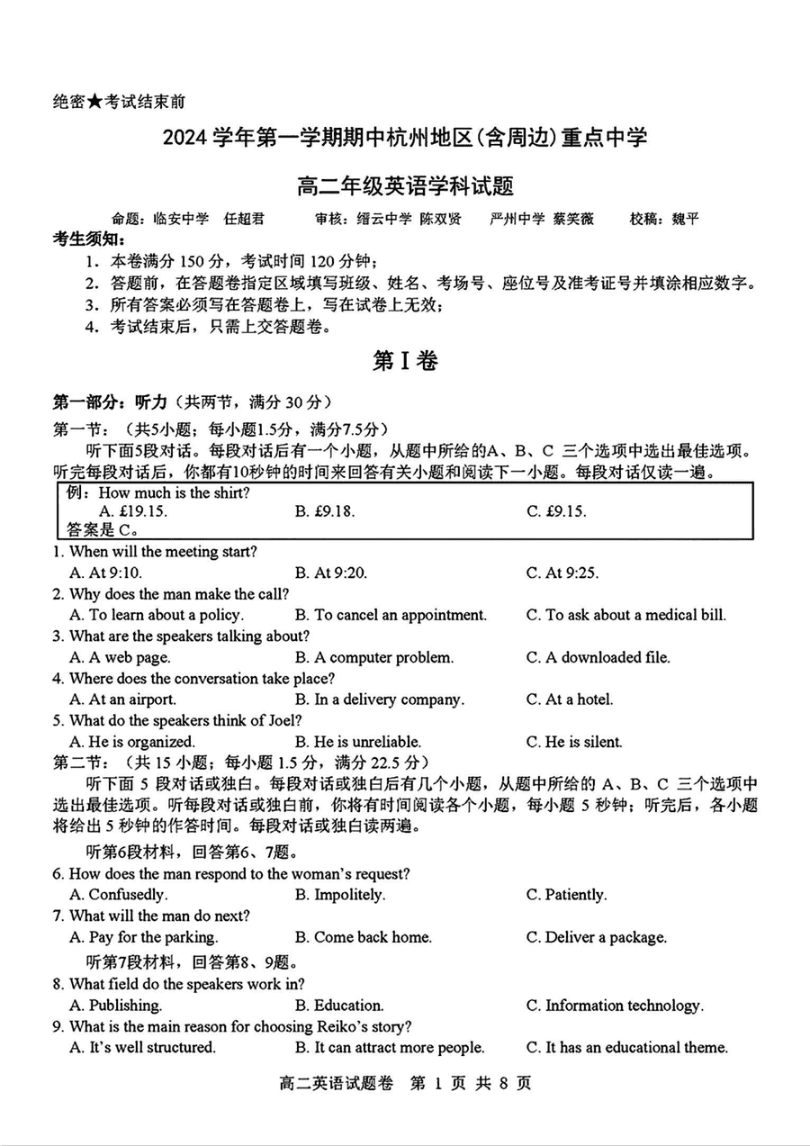 杭州重点中学2024-2025学年高二上学期11月期中英语试题及答案