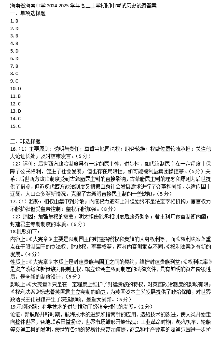 海南中学2024-2025学年高二上学期11月期中历史试题及答案