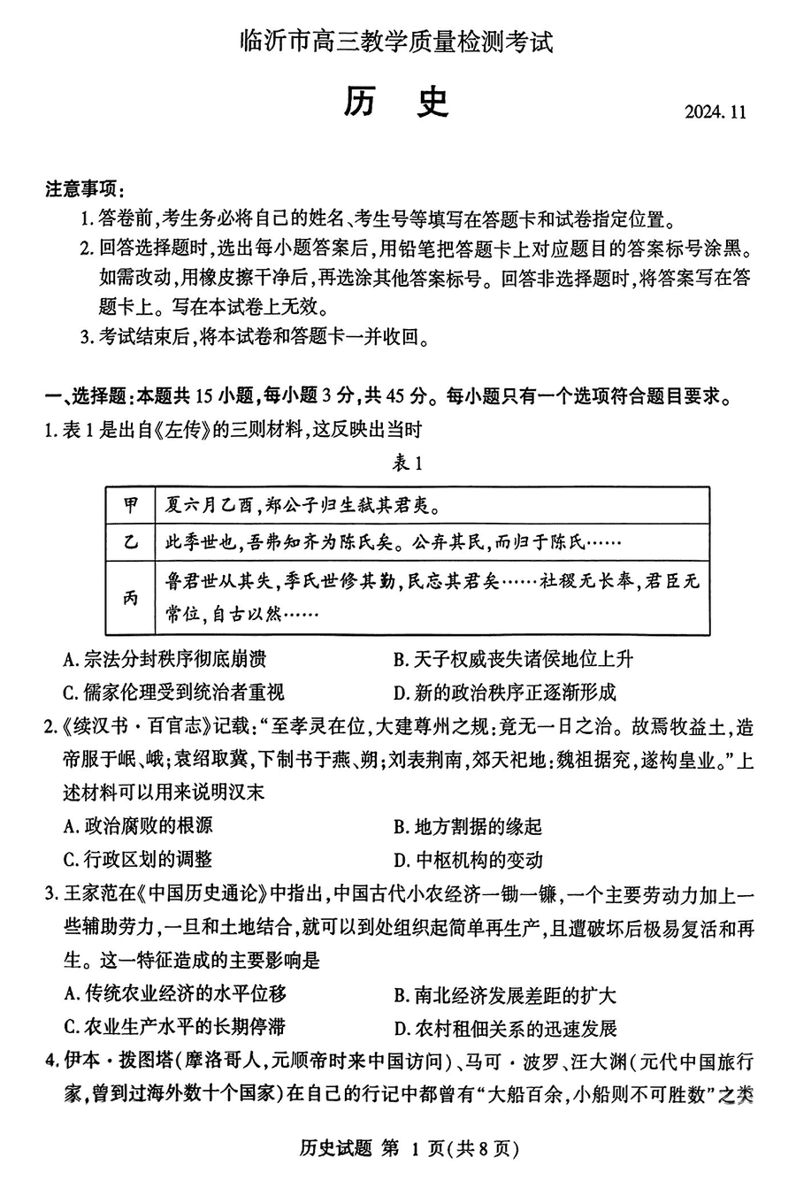 山东临沂2025届高三上学期11月期中质检历史考试已于近日开考,为方便考生考后及时查看考试情况,查漏补缺、弥补不足,本文整理了试题答案解析相关信息!